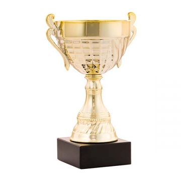 Copas deportivas clásicas con vaso dorado con asas y la peana de mármol negro.